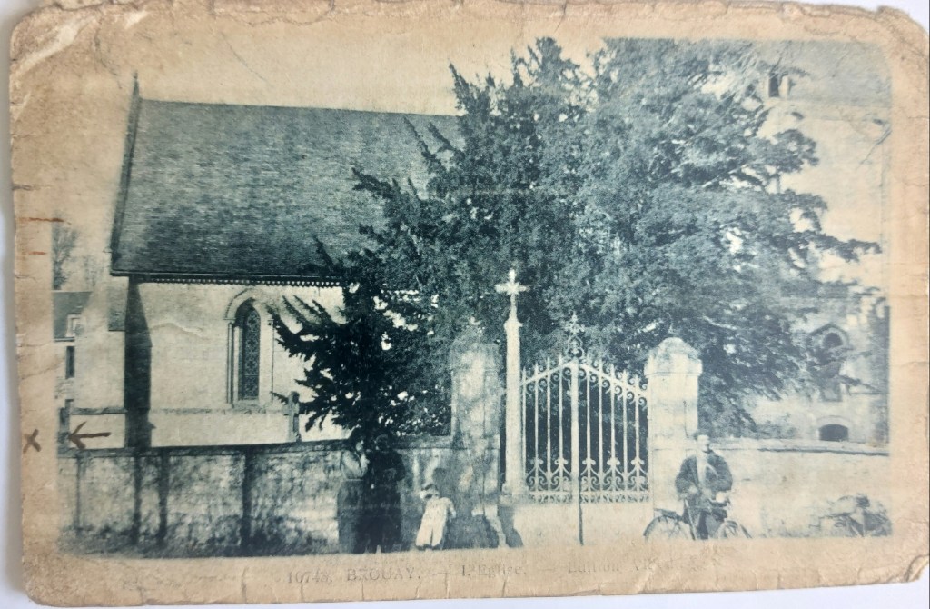 Below : A contemporary post card of the church at Brouay c.1930’s . The cross indicates where Sgt.Gunn, & Gnr’s Wheaton & McMorland were buried inside the church wall. (see top of the page). below – the same same shot taken when we visited in 2003.