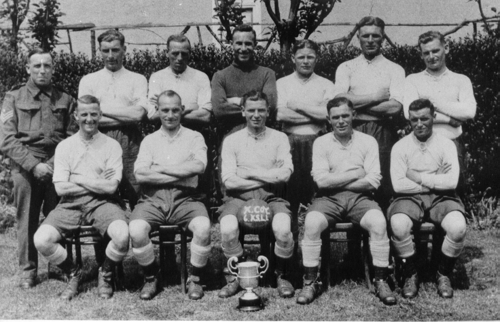 At the centre of this group is Captain (probably a Lieutenant then) Dudley Shaw holding the ‘Portland Cup’ which figures strongly in the history of 6KSLI. The cup was awarded to 6 KSLI after a football match against an RAF team that featured more than one ex-England player, although, 6 KSLI were represented by at least four professional players. . The cup was won in 1940 and I would guess that this photograph was taken soon after the game, before the Battalion became a Field Regiment R.A.. The cup went on to become something of a Regimental mascot, and accompanied 181 field regiment through war, having sustained a few dents along the way. The cup is now held at the Light Infantry Museum.