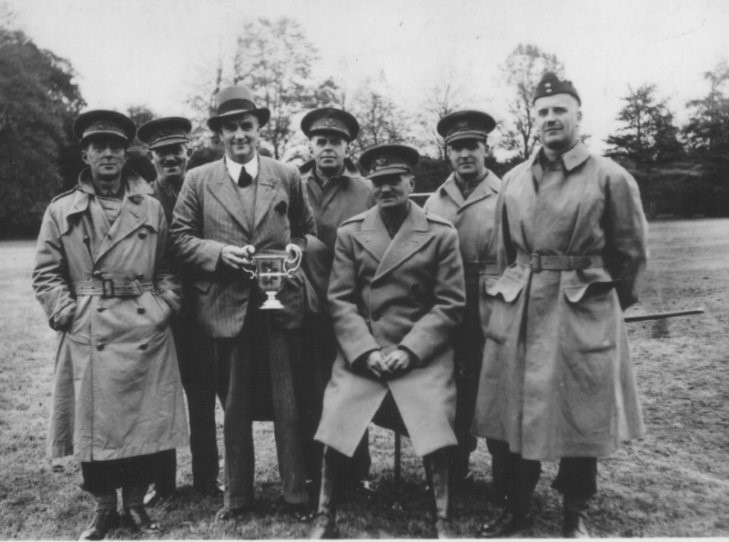 It looks very likely that this is the first presentation of the ‘Duke of Portland Cup’ Won by 6KSLI after competing in a football tournament with all the other units within the division. Afterwards it became the Battalion sports trophy and went to war with 181 field Regiment under the care of Captain Prutton 179 Bty, where it took pride of place in the Officers Mess. Seated Lt.Col. RBS Munn, on his left Capt Maurice, second left, standing, Lt Raitz. C. 1940.