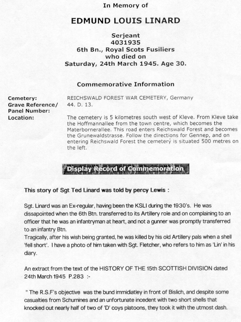 A fine photograph of two Sergeants and old pals. On the left is 4031935 Sgt Edmund ‘Lin’ Linard on his right 4031603 Sgt Richard ‘Dick’ Fletcher. These two old sweats were regular soldiers who originally enlisted into the 1st Bn during the 1930’s and were re -enlisted into the 6KSLI at the outbreak of War. I’d guess this photo was taken just after the 6KSLI converted as there is little insignia and the men are wearing the old style ‘cheese cutter’ SD caps, with the familiar Artillery ‘Gun’ badge. A very sad story surrounds Sgt Linard. He complained that he was really an Infantryman at heart and requested a transfer to the Infantry. A short time afterwards he was killed by ‘short firing’, possibly by shells from his old Regiment, a tragedy of War. I did some research on the subject, and discovered that he was transferred to the 6Bn Royal Scots. An extract from the divisional history, 24.03.45. p.283. The RSF’s Objective was the bund immediately in front of Bishlich, and despite some casualties from shu-mines, and an unfortunate incident with two short shells that knocked out nearly half of D coy’s platoons, they took it with utmost dash. The day Linard was killed. See CWGC. Entry.