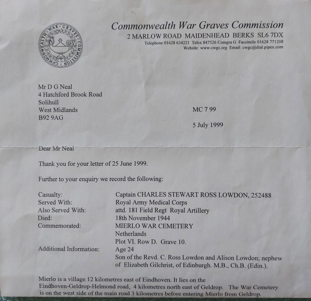 In a series of letters from Captain John H. Thomlinson, he described the circumstances around Stewart Lowdon’s death ” A splendid young Doctor, Stewart Lowdon Asked me if I would help recover the body of his medical orderly who had been killed in a minefield we and other helpers took the C/O’s half track. We found the body and reversed the vehicle slowly up to it. All seemed welland Lowdon went to the back to ift the body on board. Sadly there was another mine and the extra weight at the rear set it off . We had a jeep with us but by the time we had got him to the field dressing station- he was dead. Suppose we should have been reprimanded for taking unnecessary risks, but there are some situationswhere it is impossible to say ‘No’. Note: The Medical Orderly – Bdr Marklew was also killed whilst retrieving a body from the minefield, see page ‘A final tribute’.
