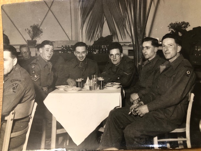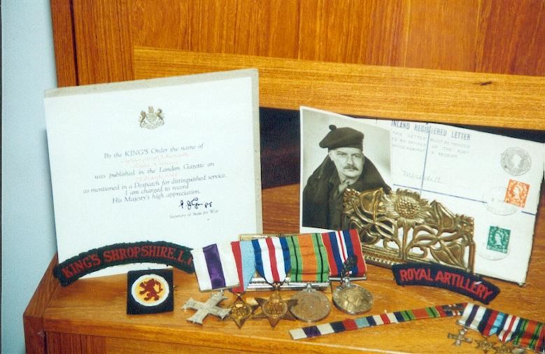 John relaxes in his local. Born and raised in Brecon, John was living and working in Whitchurch when he enlisted into the 6th Bn KSLI 26.07.40 number 4040591. His soldiering qualities were soon spotted, and he quickly rose through the ranks, taking a commission after only 4 months. He returned to 6 KSLI as 2/Lt serving in Y Coy. Eager for action, John was one of the eighteen Officers who elected to transfer to the Artillery, he was promoted to Captain 01.01.43 after attending the Artillery Officers training course at Catterick. By the time of the Invasion of France in June 1944 John was C Troop leader, 178 Bty. A highly respected Officer, he led his men by example. Twice wounded and twice decorated for his valour in action. Always at the front as observation Officer, his drivers, Charlie Ashton and Percy Lewis, spoke of his coolness and determination in a tight spot. His care for his men was illustrated at the end of the War when he organised fund raising for the next of kin of those men killed in action in Charlie Troop, accompanied by a personal letter to each of them. Sadly, John died in 1992 before I had chance to meet him. I was very pleased to visit his son, Bill, who kindly allowed me access to his father’s memorabilia.